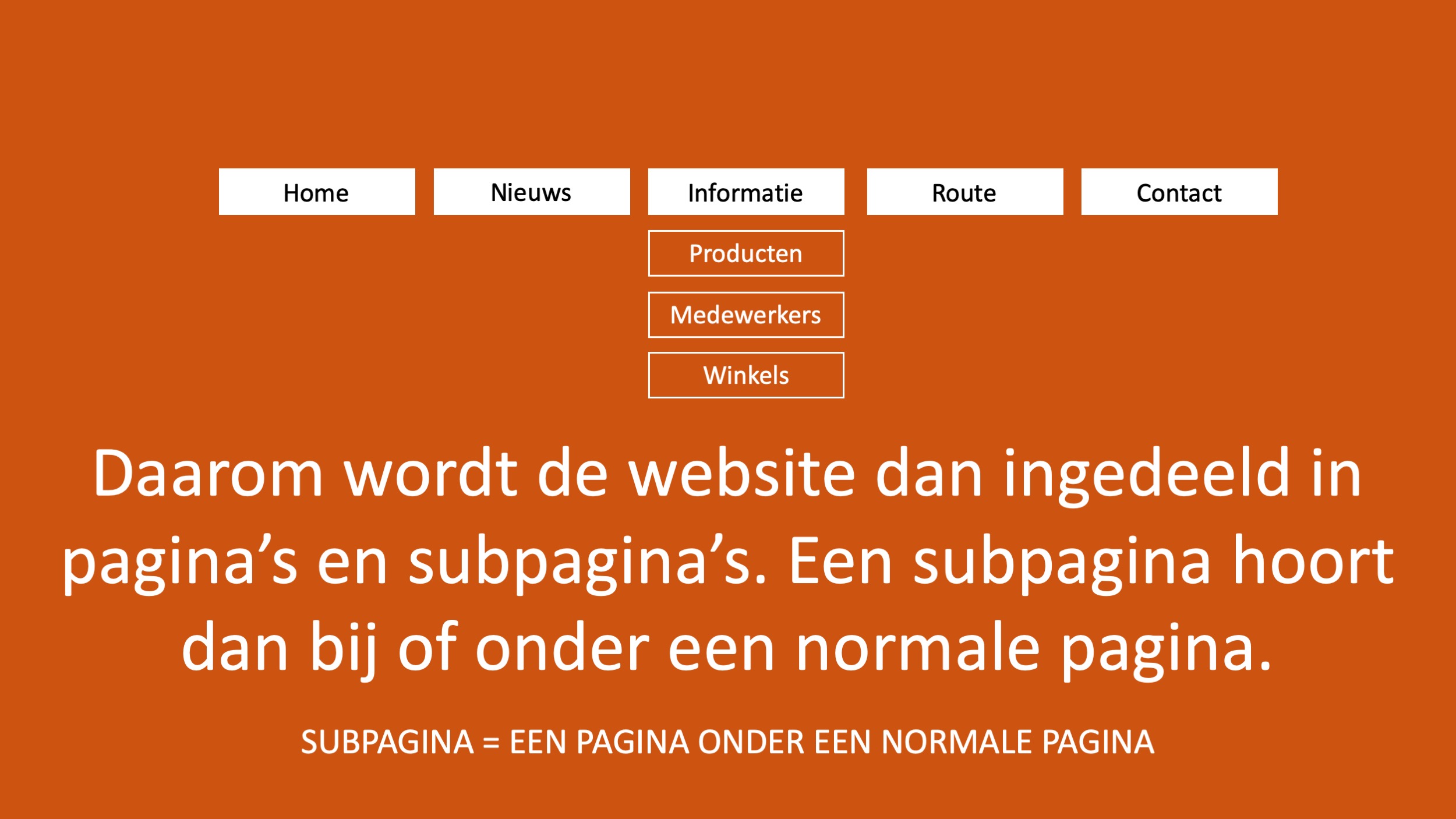 De website van Schiphol heeft heel veel pagina’s, maar er zijn maar een paar knoppen in het menu. Als je je muis op een knop houdt, dan verschijnen er weer andere knoppen. Dat is het submenu. De pagina’s in het submenu noem je subpagina’s.
